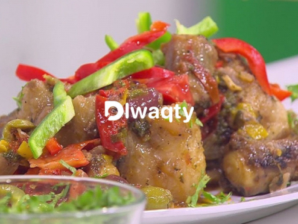 يضاف الفلفل الرومى والطماطم والكزبرة ثم الزيتون